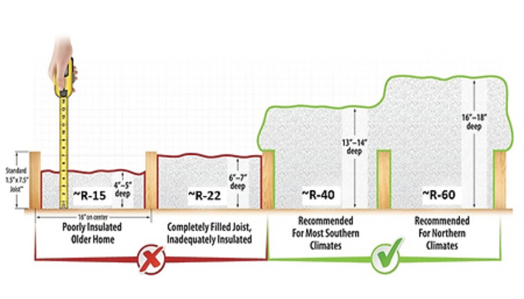 In Ontario, building regulations have only increased over time (in 1992, R-value requirements were R-30, but now R-value requirements are R-50/60). If your home is over 25 years old and insulation in your attic has never been updated, it is likely that your R-Value between 15 – 30 since insulation materials settle over time. Moreover, if your house was built in the early ’70s, you may just have a little bit of insulation in the attic or even empty cavities between the joists. Therefore you would need to bring it to today’s’ standards by adding insulation.